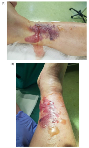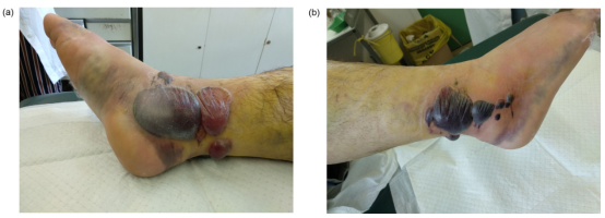 图3 胫骨远端骨折患者同时出现充血水泡和透明充盈水泡(a:前方;b:内侧)