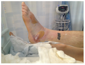 图2 a:踝关节骨折患者出现内侧充血水泡;b:跟骨骨折患者出现后足充血水泡
