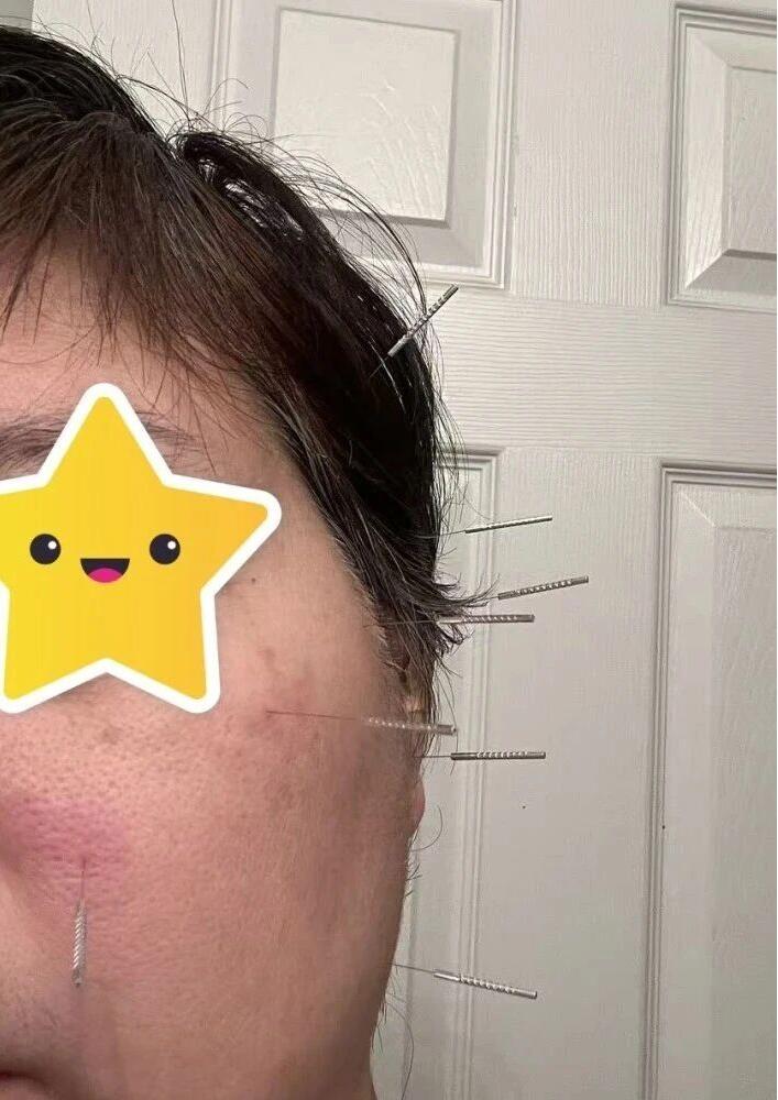 第二天,发现右侧耳尖处和下巴处有疱疹,考虑“带状疱疹”,于医院看诊,服用“伐昔洛韦”抗病毒治疗。但是右侧头部放射性闪电样剧痛未消失。自行扎颊针:取右侧头穴,颈穴,肩穴,背穴,骶穴,肘穴,腕穴,头部阿是穴。一次好了九成。连续再扎两天,痊愈。