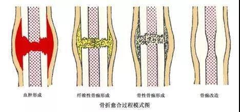 骨的再生能力很强,经过良好复位后的外伤性骨折,一般在3~4个月或更长一些时间内,可完全愈合。骨外、内膜中骨母细胞的增生和产生新生骨质是骨折愈合的基础。骨折后经血肿形成、纤维性和骨性骨痂形成以及骨痂改建的过程而完全愈合,使骨在结构和功能上恢复正常。