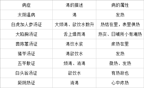 “渴”症在一定程度上能揭示疾病的性质。例如,《伤寒论》对渴症属性的描述是: